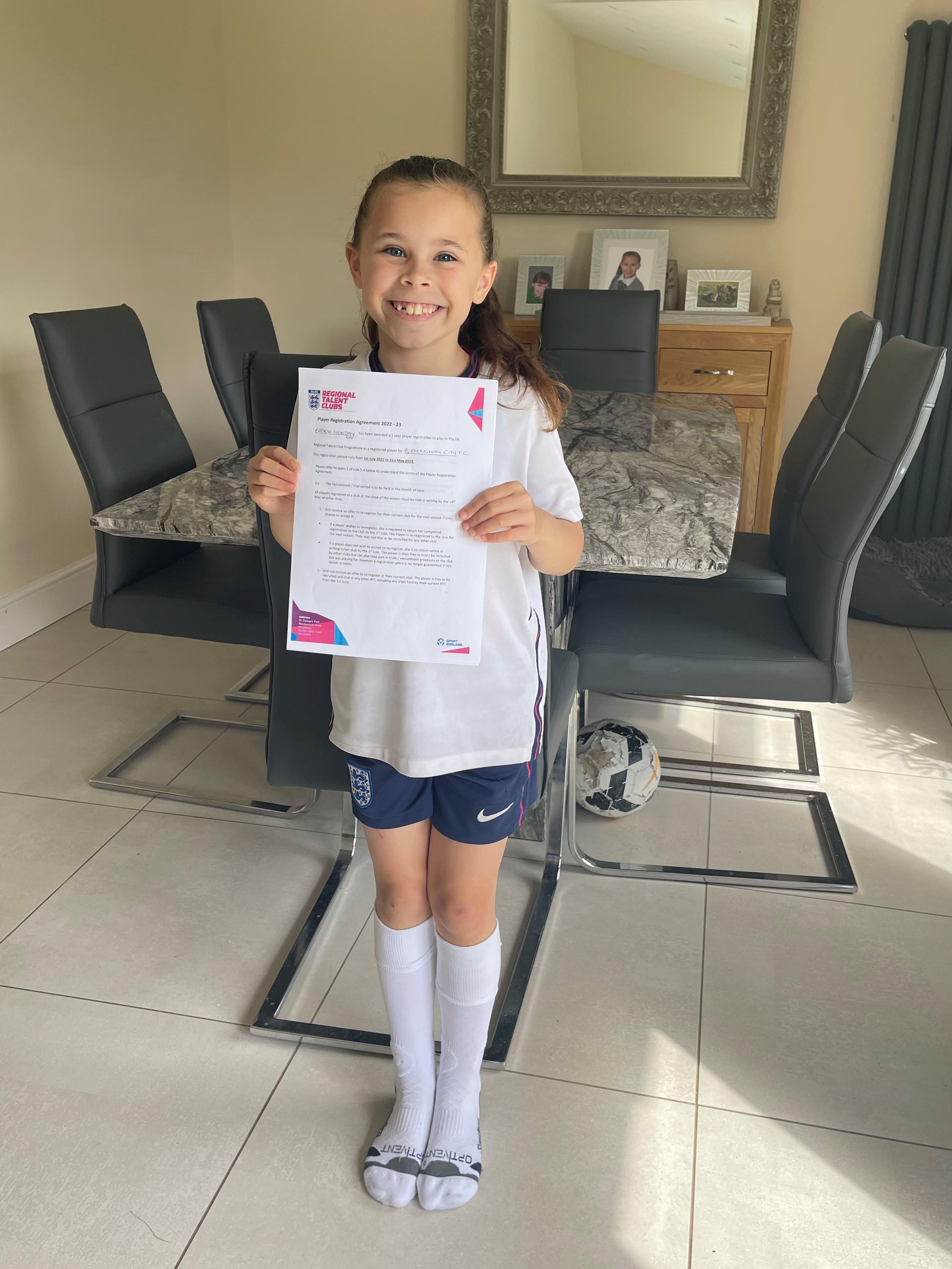 Erona has been training with older girls at Birmingham City & Aston Villa Football Clubs, last season. She has completed 3 trials and has been offered contracts with Birmingham City’s U10s, West Bromwich Albion’s U10s and Aston Villa’s U9s.