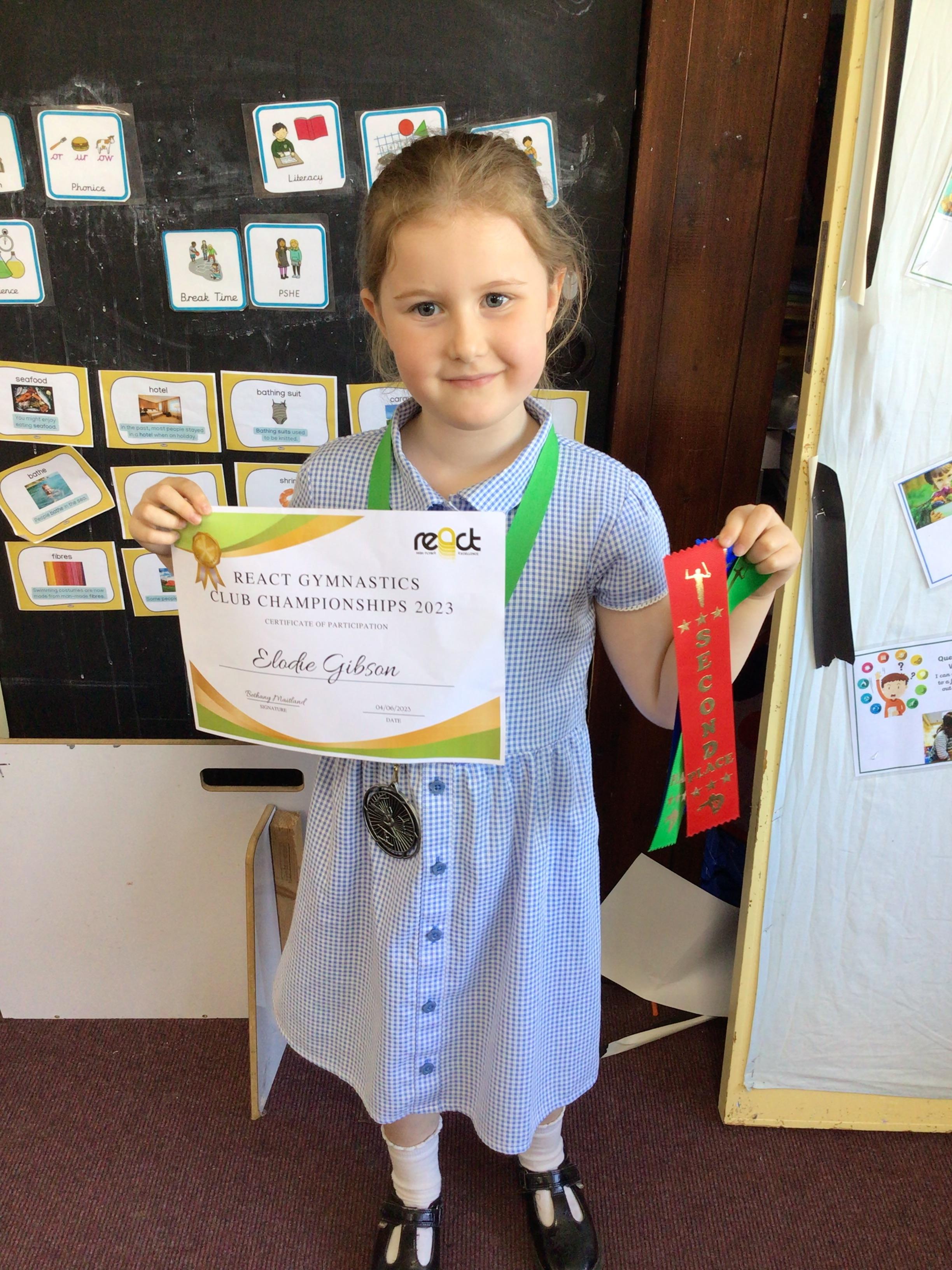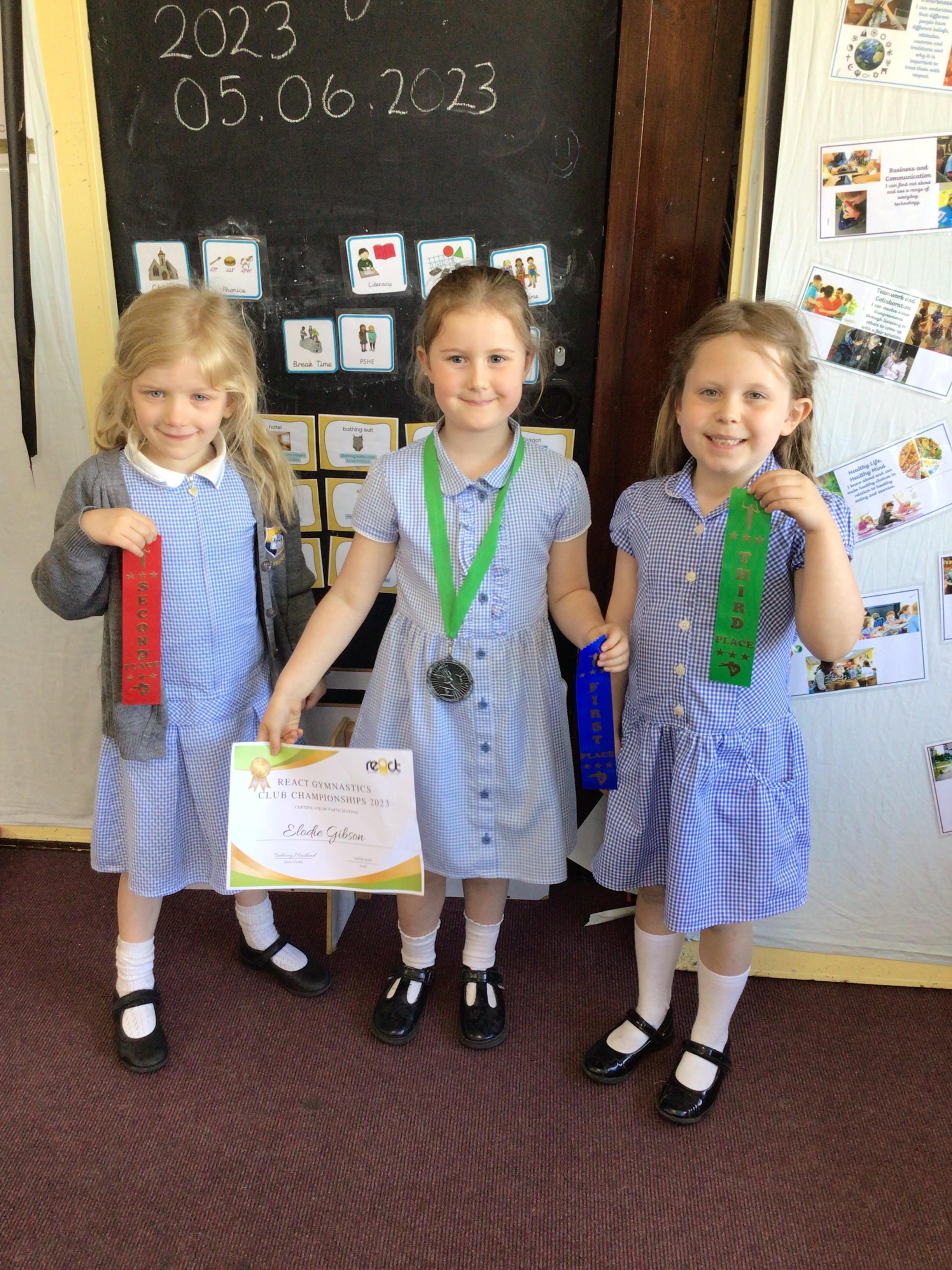 Elodie, Jennifer, Emilia from 1C took part in a REACT Gymnastics competition last weekend. We were so proud to hear all about their achievements and were really pleased to be able to see the awards and medals too.