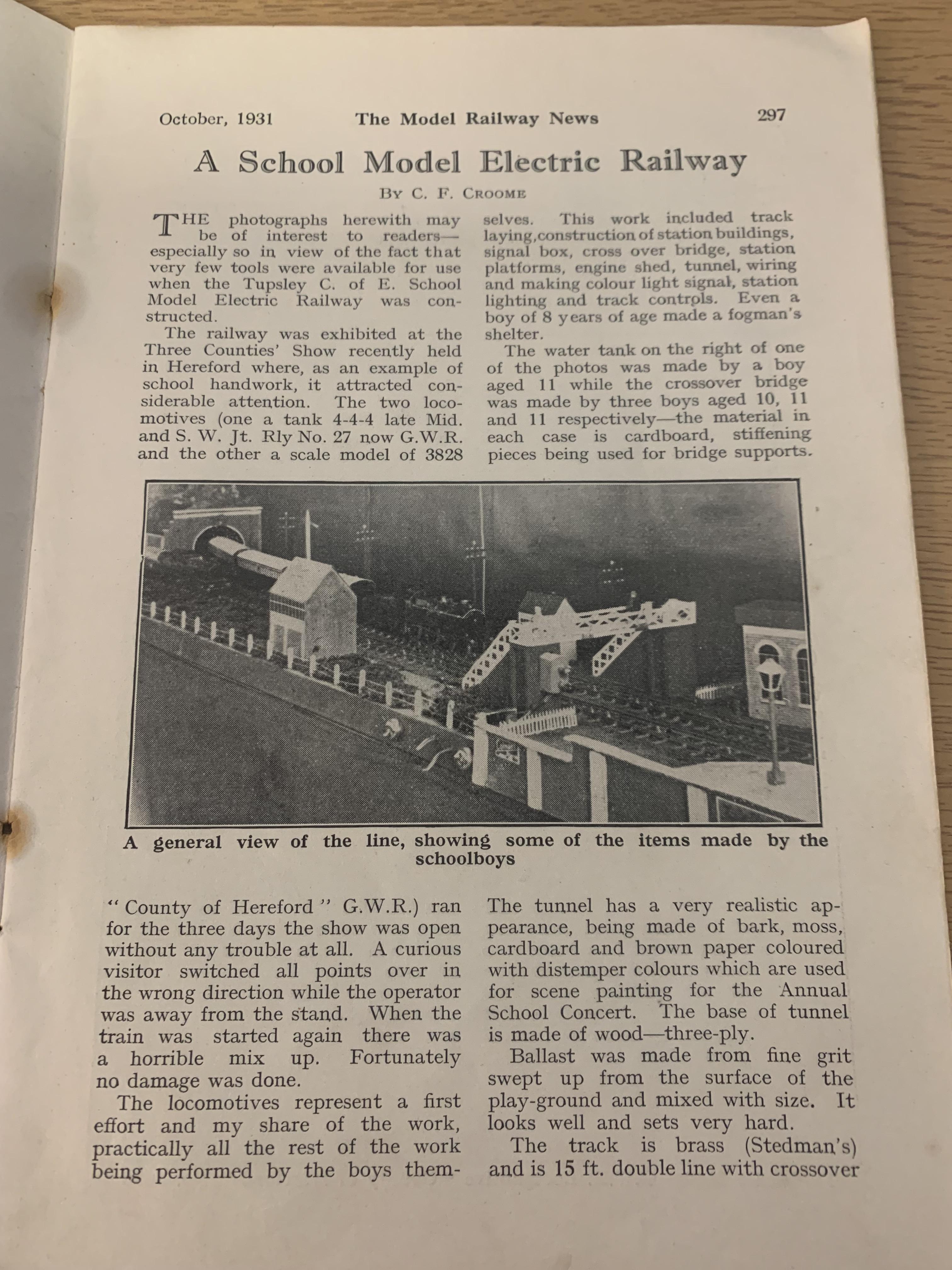 Thank you to Mr Vincent, a pupil of St Paul's from 1954 - 1959. Mr Vincent has kindly given us his original copy of the 1931 edition of The Model Railway News. Photographed is a wonderful article written about the Tupsley School Model Railway.